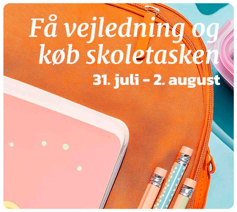 I Bog & idé kan du fylde skoletasken med alt, som skal bruges i penalhuset og meget mere. Sammensæt indholdet til penalhuset hos SKRIVEBAREN i butikken med blyanter, viskelæder, kuglepenne og meget mere – et farverigt og kreativt hjørne. Fortsæt turen rundt i butikken og find lineal, vinkelmåler, kalender, notesblokke, mapper og mere. Efter en tur i Bog & idé kan I fortsætte i Imerco Home, hvor de har et udvalg af praktiske og holdbare madkasser og drikkedunke. Lad butikkerne hjælpe med at fylde skoletasken.